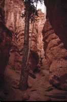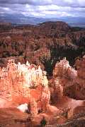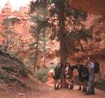 Left partly flooded campground for scenic drive to Bryce Canyon. More heavy rain and awful forecast, so looked at grotty motel, but then sun came out so camped at Bryce North Campground. Walked Navajo Loop and Queens Garden trails. Amazing Hoodoos (rock pillars). Thunder storm. Went for "all you can eat" Cowboy Buffet (except Trudi who opted for mouldy bananas instead). Drove round in circles looking for moonlight view of the canyon. Day 5 Got up to see sunrise over canyon (hint of pink in a black cloud). Drove to Bryce Point. Ranger described weather as "freaky" - heavy showers and sunny intervals - seemed like a typical summer to us. Loads more hoodoos. Walked "Hat Shop" trail. (Amazing hoodoos being formed - huge boulders of hard rock balanced impossibly on slender columns of eroding sandstone). Scenic drive to Rainbow Point. Early to bed leaving Debs with campfire and wine box for company. Awoken by Park Rangers "We have an intoxicated woman here!". |