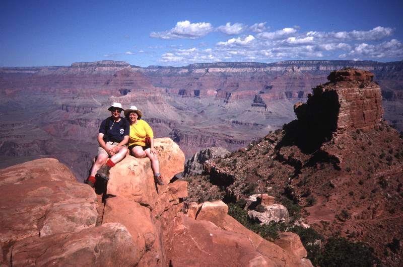 Best and Biggest ever Breakfast Burrito at Honest Ozzies, Moab. Highly recommended. Debbie's left-overs kept Trudi going for two days. To Needles district of Canyonlands via Newspaper Rock (ancient Indian petroglyphs). Heat gave way to incredible thunder and hail storm, transforming the desert with flash floods. Drove hundreds of miles across the Bog from Hell (formerly the Utah Desert), in Trudi's ceaseless quest for sun and water sports, to camp by (or in) Lake Powell. Day 10 - "I don't mind what we do, but…" Awoke to scenes reminiscent of a bad day in Scotland. Newspaper weather map showed nearest good weather in Colorado, so we packed up for a few more hundred miles to Four Corners (where Utah, Arizona, Colorado and New Mexico meet). Photographed each other on the intersection of the state lines. Delicious Indian frybread for lunch. On to Mesa Verde National Park, Colorado, for the best ancient Indian ruins in the U.S. Over 600 dwellings hidden in the cliffs by the Anasazi Indians (more correctly "Ancestral Puebloan Native Americans") more than 700 years ago. Trudi & Dave hiked the "knife-edge trail" and nearly got struck by lightning. (Weather had been good until we arrived). Day 11 - "Ladder Lickers" Fascinating tours of Cliff Palace and Balcony House ruins involving climbing ladders and crawling through tunnels. Delightful walk to Spruce Tree House and Petroglyph Trail. |