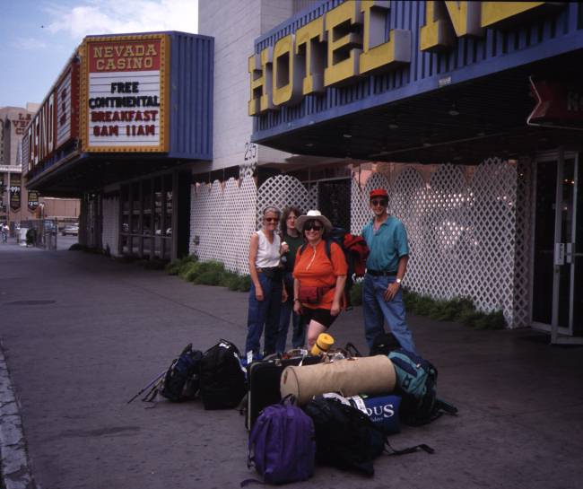 Panic! NorthWest Airlines on strike! Thought we might get no further than London, but luckily re-routed and only a couple of hours late. Greeted by acres of slot machines at Las Vegas airport - plenty of opportunity to lose all our holiday money before even reclaiming our baggage. Picked up our "Chevrolet Astro Van", and drove down "The Strip", passing Pyramids, Statue of Liberty, pirate ships and an erupting volcano, all illuminated by dazzling neon lights. Arrived at the Nevada Hotel & Casino to find Debbie (arrived from San Francisco) slightly concerned that not only was our flight cancelled but the hotel had no record of our reservation! |