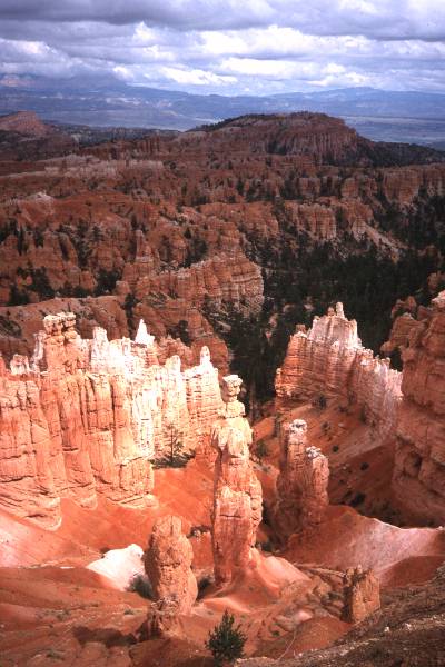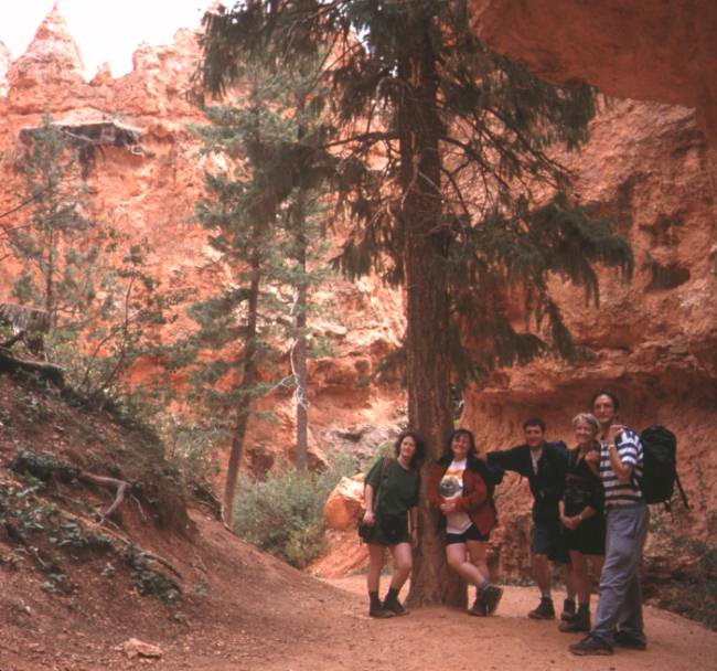 Left partly flooded campground for scenic drive to Bryce Canyon. More heavy rain and awful forecast, so looked at grotty motel, but then sun came out so camped at Bryce North Campground. Walked Navajo Loop and Queens Garden trails. Amazing Hoodoos (rock pillars). Thunder storm. Went for "all you can eat" Cowboy Buffet (except Trudi who opted for mouldy bananas instead). Drove round in circles looking for moonlight view of the canyon. Day 5 Got up to see sunrise over canyon (hint of pink in a black cloud). Drove to Bryce Point. Ranger described weather as "freaky" - heavy showers and sunny intervals - seemed like a typical summer to us. Loads more hoodoos. Walked "Hat Shop" trail. (Amazing hoodoos being formed - huge boulders of hard rock balanced impossibly on slender columns of eroding sandstone). Scenic drive to Rainbow Point. Early to bed leaving Debs with campfire and wine box for company. Awoken by Park Rangers "We have an intoxicated woman here!". |