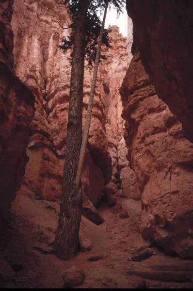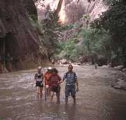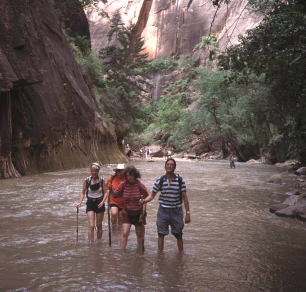 Went to get meths for the Trangias (which would have been impossible without Gareth's advice to buy "denatured alcohol" from a hardware store). Goat stew for lunch at Filipino restaurant. Long drive to Zion National Park. Cruise control and air conditioning are not luxuries. Hot evening walk to Emerald Pools (which were a bit dried up). Hammered tent pegs into the baked earth of Watchman Campground. Day 3 - "The River is the Trail" Spectacular scenic drive up Zion canyon to Temple of Sinawava. Waded up the Zion Narrows, until it became groin deep. View points of Great White Throne and Weeping Rock, followed by trail to Canyon Overlook. Started raining. |